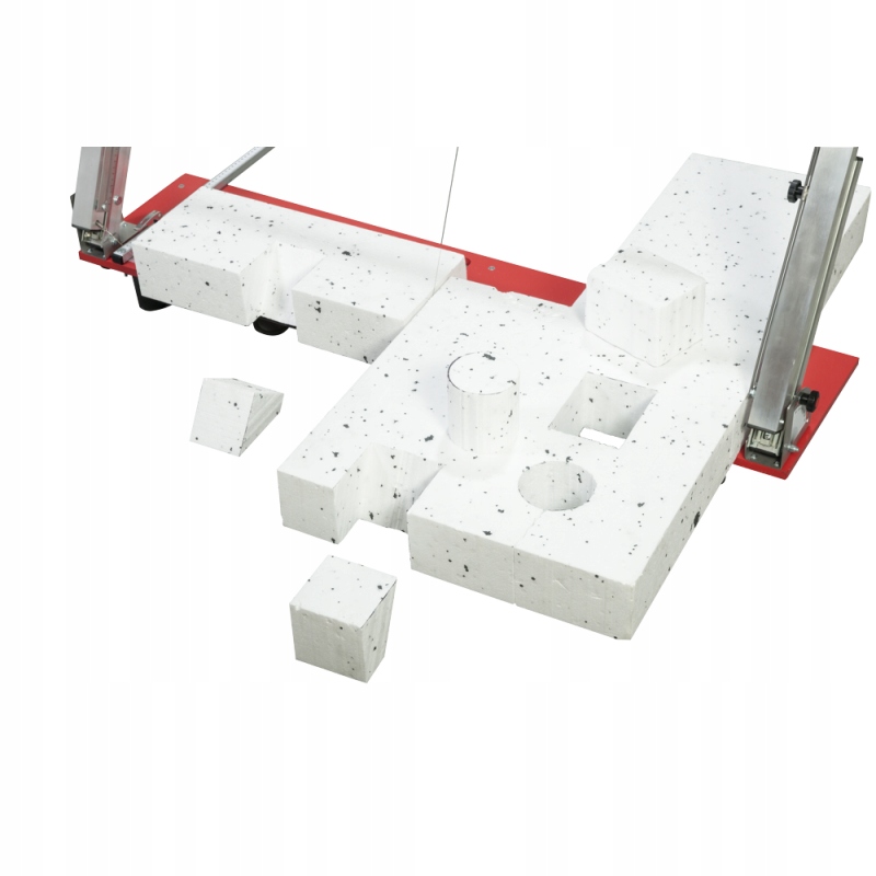 Ta wersja maszyny do cięcia styropianu i styroduru także wyposażona została w możliwość przełożenia drutu do cięcia w pionie. W szybki i prosty sposób, dzięki tej funkcji można wycinać z płyty styropianu różne kształty: „elki”, kółka, kwadraty, wpusty pod krokwie itp. Świetnie nadaje się również do wycinania elementów sztukaterii takich jak: listwy, bonie, zworniki itp.