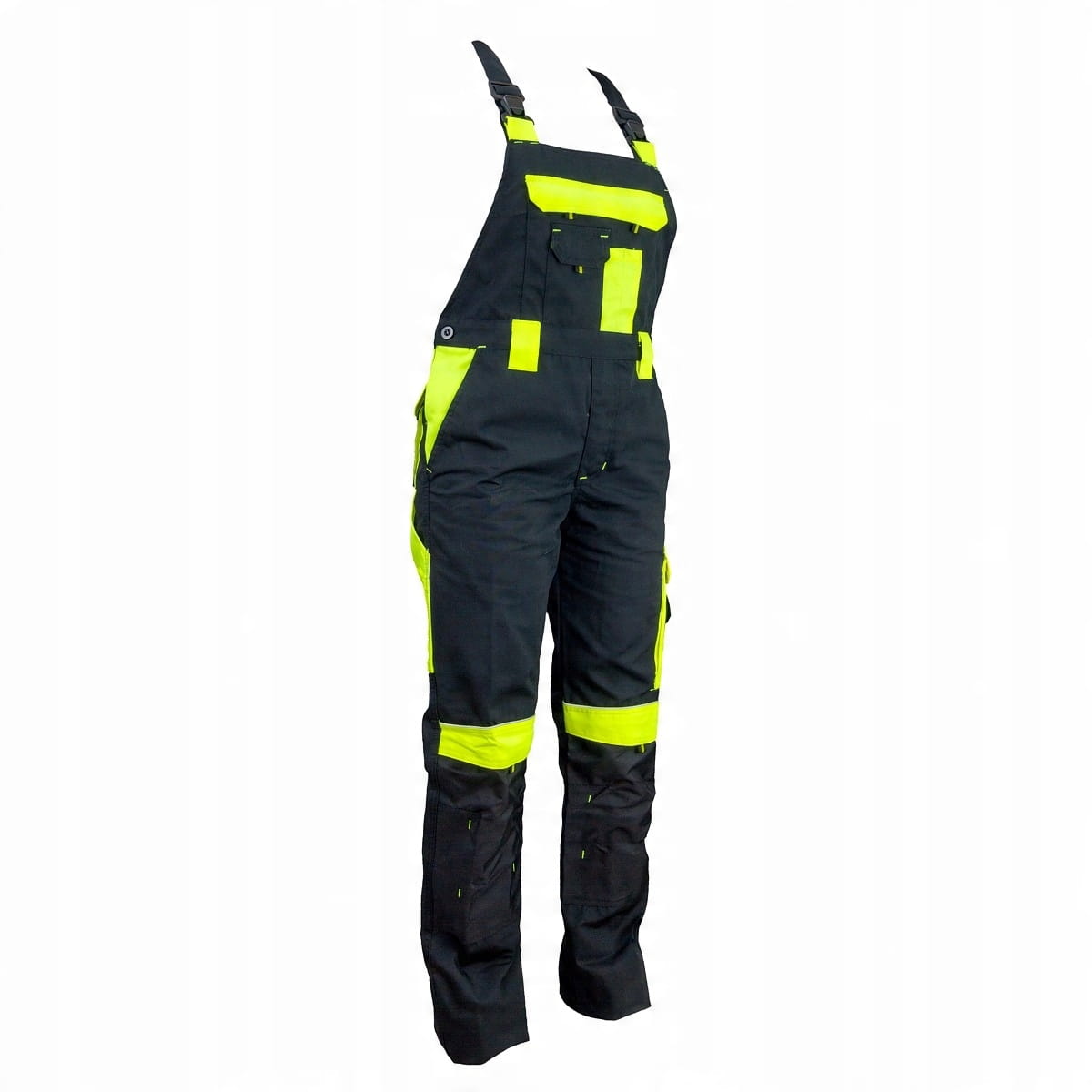to odzież ochronna o świetnym stosunku ceny do jakości. Materiał wykonania to mieszanka 65% poliestru i 35% bawełny o sumarycznej gramaturze 260g/m2. Rozporek na guzik i zamek błyskawiczny. Regulacja w pasie na guziki. 7 kieszeni na niezbędne przedmioty, w tym jedna duża piersiowa. Dla osób pracujących w pozycji klęcznej przewidziano kieszenie na nakolanniki zapinane na rzep. Wstawki z materiału w kolorze żółtym ostrzegawczym zwiększają widoczność. Szlufki na pasek pozwalają na lepsze dopasowanie.